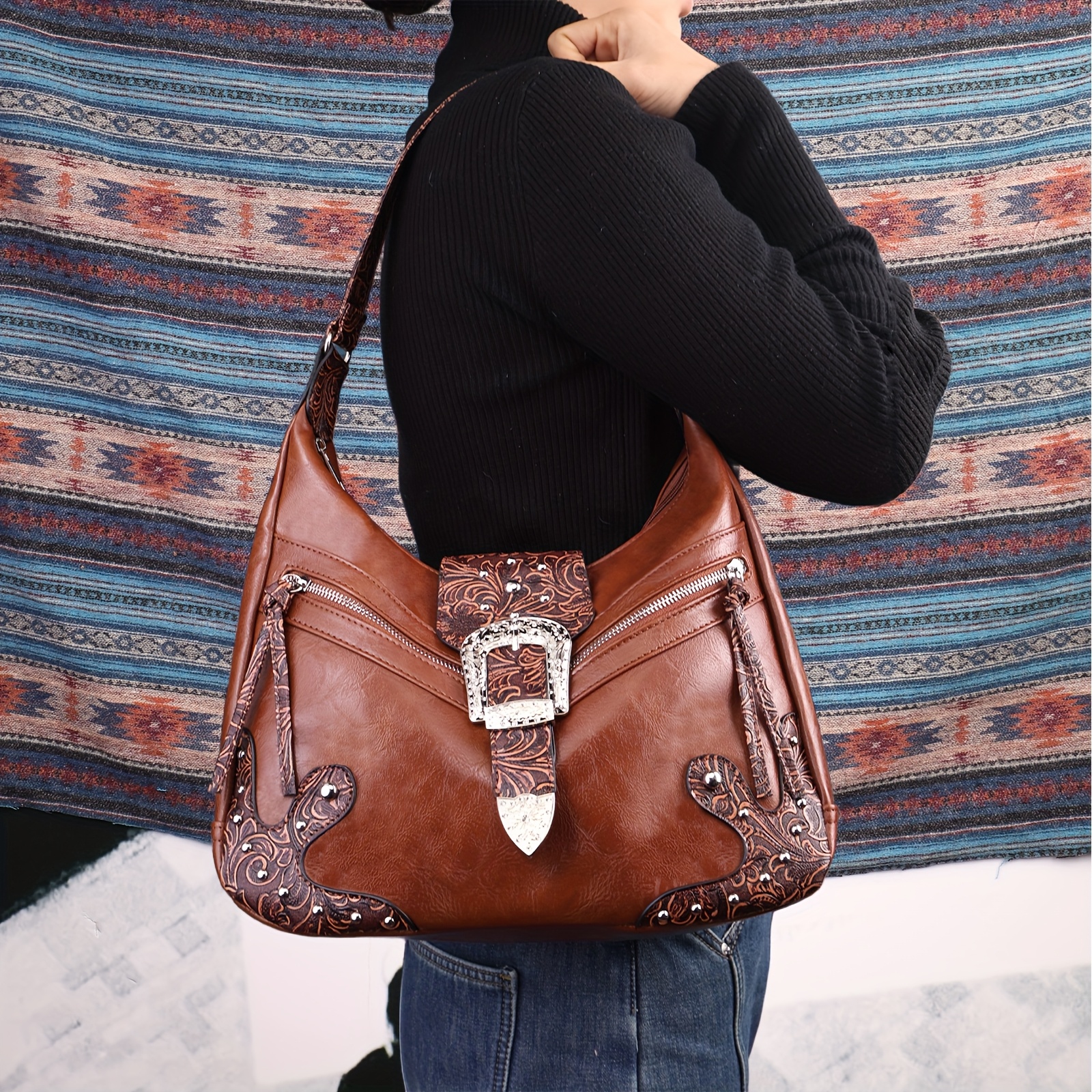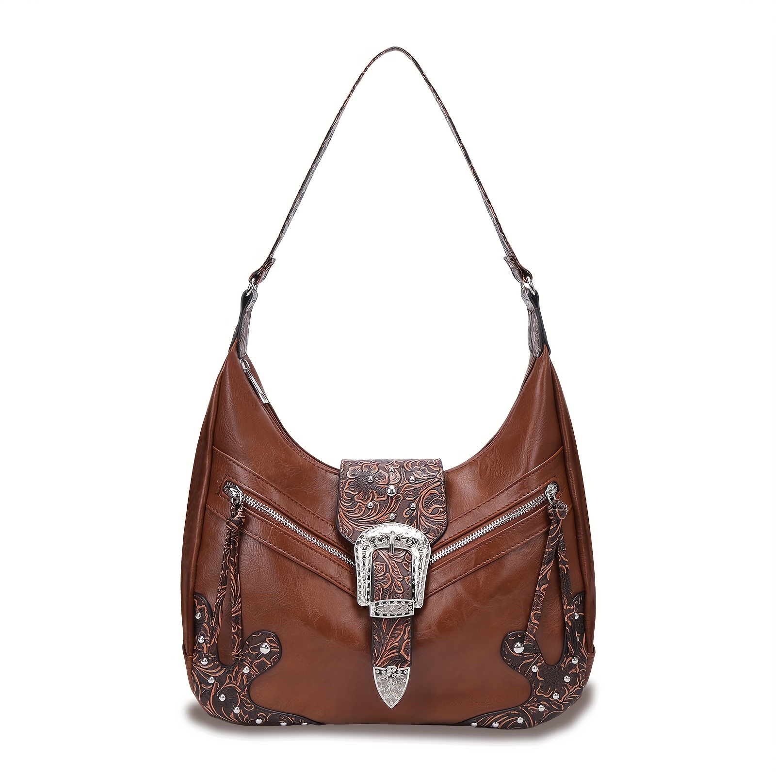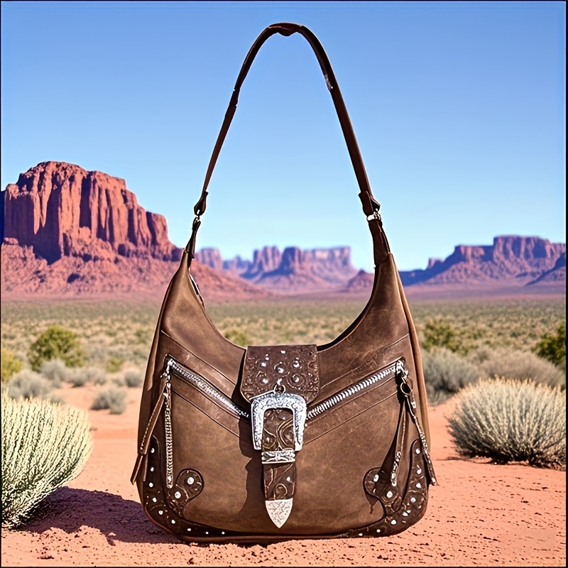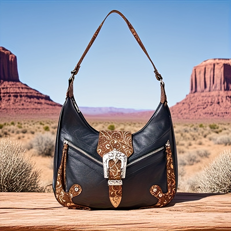 Bohemian Western Saddle Bag – Shoulder Purse with Zipper & Buckle Closure, 3 Outer Pockets, Floral Embossed Design, Large Capacity for Daily Essentials, Commute, Work, Events, and Travel, Event Accessory | Rustic Western Charm | Bag