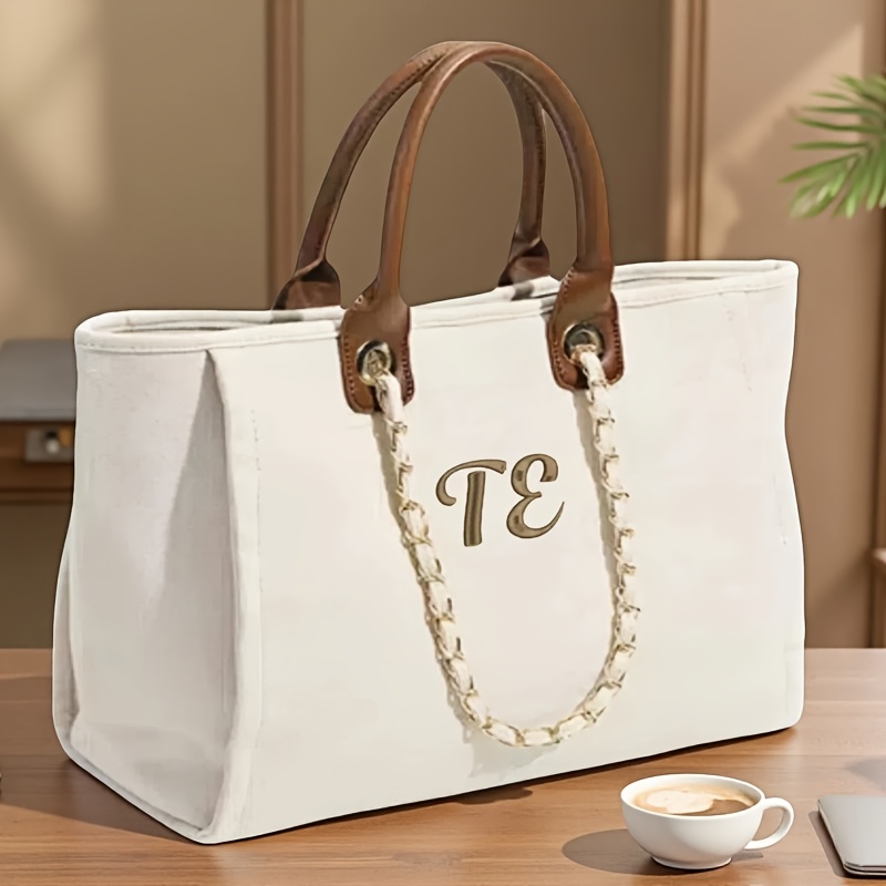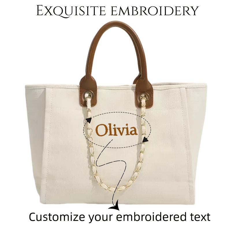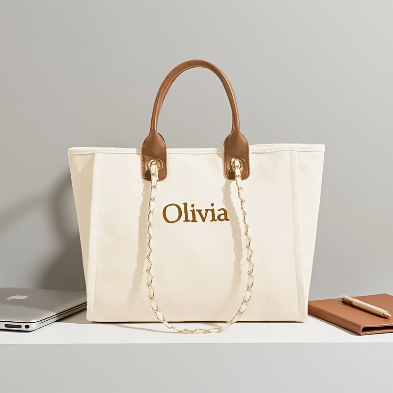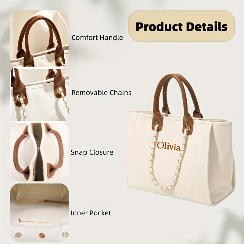 - Personalized Custom Embroidered Name Tote Bag for Women – Durable Beige Shoulder Bag with Removable Chain Straps & Zipper Closure, Casual Work Handbag for Everyday Use, Polyester Lined Interior