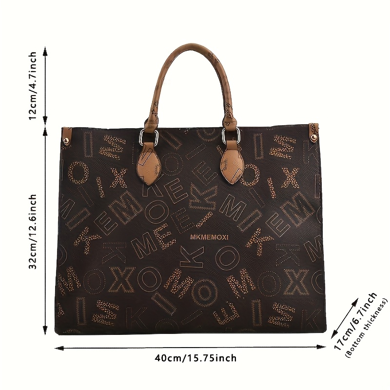 Women’s Coffee Tote Bag with Letter Print & Metal Accents – Spacious Rectangular Design, Double Handles & Zipper Closure for Work, Casual, Shopping, Everyday Carryall, Sturdy Handle Construction